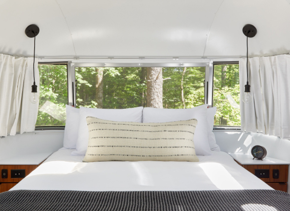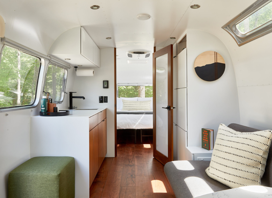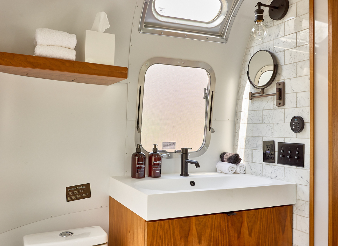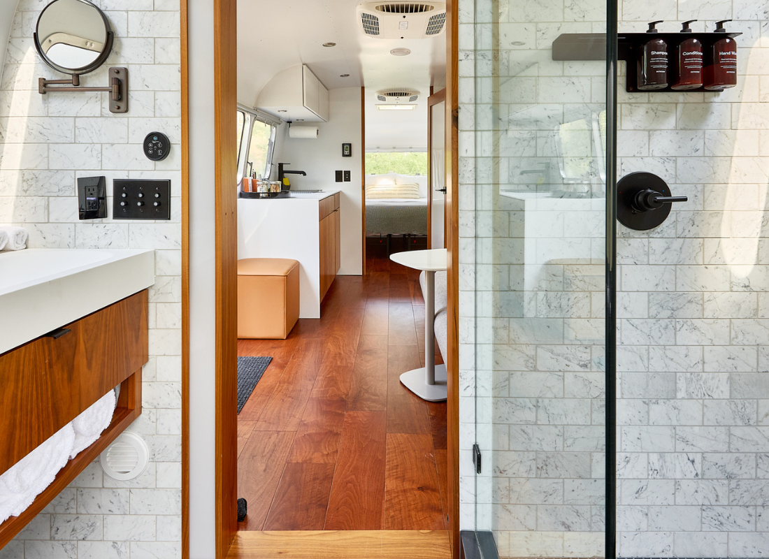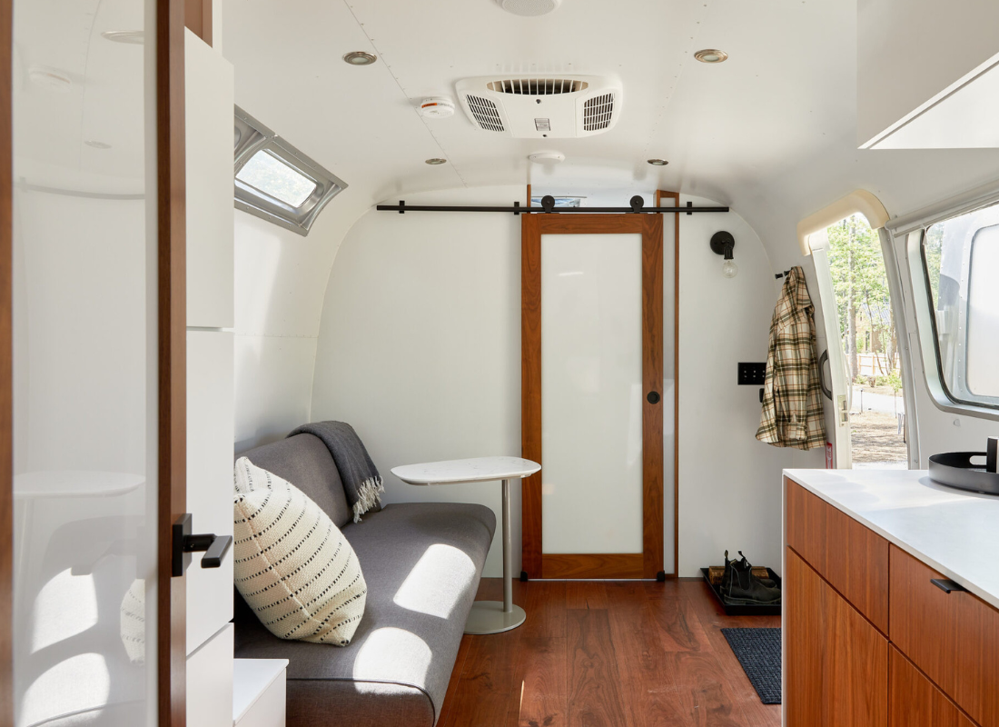 Shared Airstream with queen bed, pull-out sofa, and ensuite bathroom. Ideal for two besties sharing the adventure.